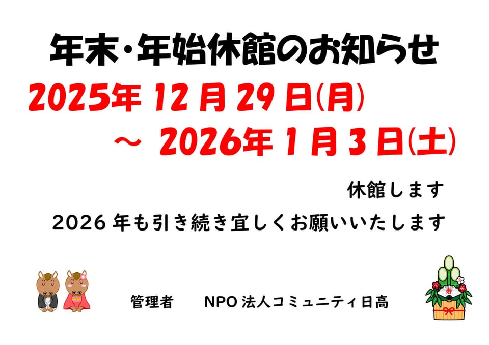 日高文化体育館 年末年始休館のご案内 いつもご利用いただきありがとうございます 2025年は大変お世話になりました。 2026年も引き続きご利用いただきますようよろしくお願いします。 よいお年をお迎えください。 ツイート